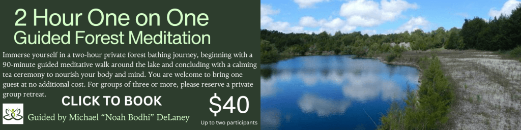 The two hour one-on-one guided forest bathing includes a full 90 minute meditative walk around the lake followed by a relaxing tea ceremony. You may bring up to one guest free. For three or more guests, please book a private group. Thank you.