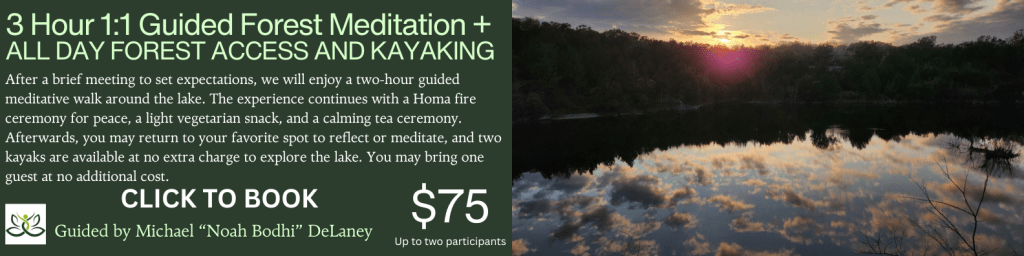 After a brief meeting to set expectations and outline our intentions for the journey, we will embark on a two-hour guided meditative walk around the lake. The walk is followed by a sacred Homa fire ceremony to invite peace, a light vegetarian snack, and a calming tea ceremony to conclude our gathering. Afterward, you are free to retrace your steps to your favorite spot to reflect and meditate in nature. Two kayaks are also available at no extra charge to explore the lake. You are welcome to bring one guest at no additional cost.